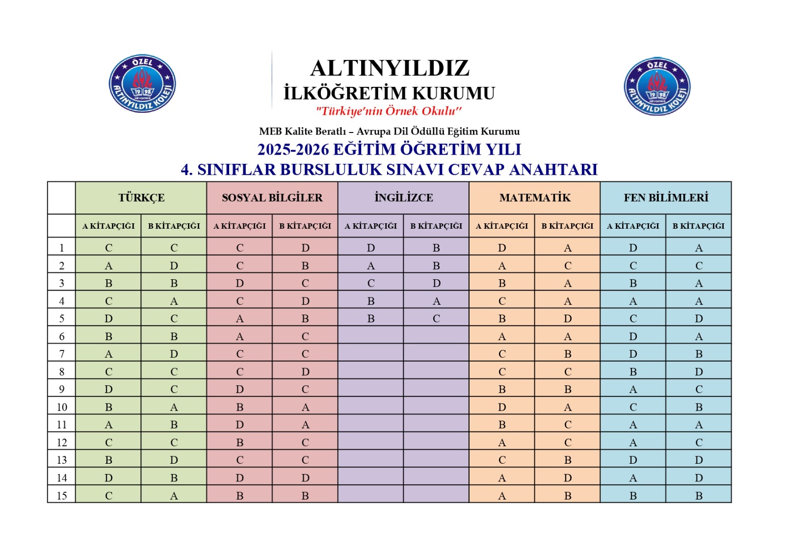 Sınavın ardından, öğrenci ve velilerimizin merakla beklediği cevap anahtarı yayımlanmıştır. Cevap anahtarına ulaşmak isteyen velilerimiz ve öğrencilerimiz, altinyildiz.k12.tr adresini ziyaret edebilirler.