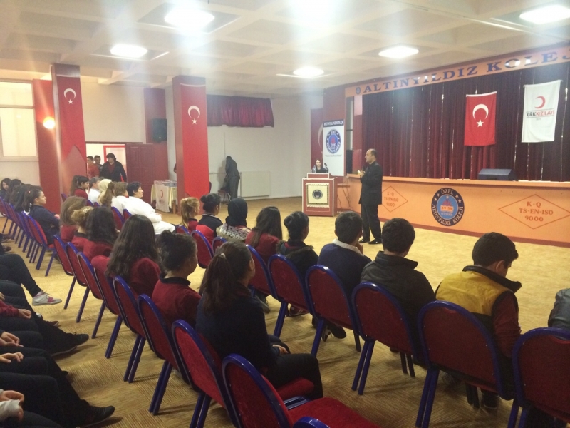 Altınyıldız Koleji konferans salonunda Kızılay Şubesi adına Dr. Süleyman KURT Kızılay’a kan bağışı konusunda bir seminer verdi. Kızılay Görevlileri Ömür Ocak ve Seval Özgan tarafından Kızılay’ın faaliyetleri hakkında öğrencilere bilgiler verdiler.