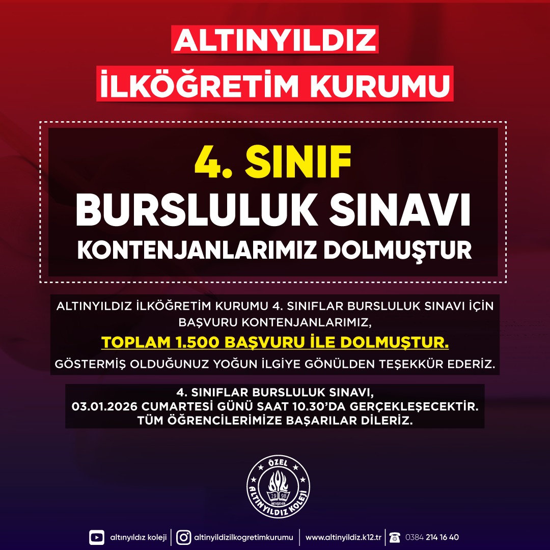 Bursluluk sınavı, 3 Ocak 2026 Cumartesi günü saat 10.30’da yapılacak. Sınavın, öğrencilere nitelikli eğitim imkânlarına erişme fırsatı sunacağı, burs imkanı sağlayacağı ve Altınyıldız’ın güçlü akademik yapısını daha geniş kitlelere ulaştıracağı ifade edildi.