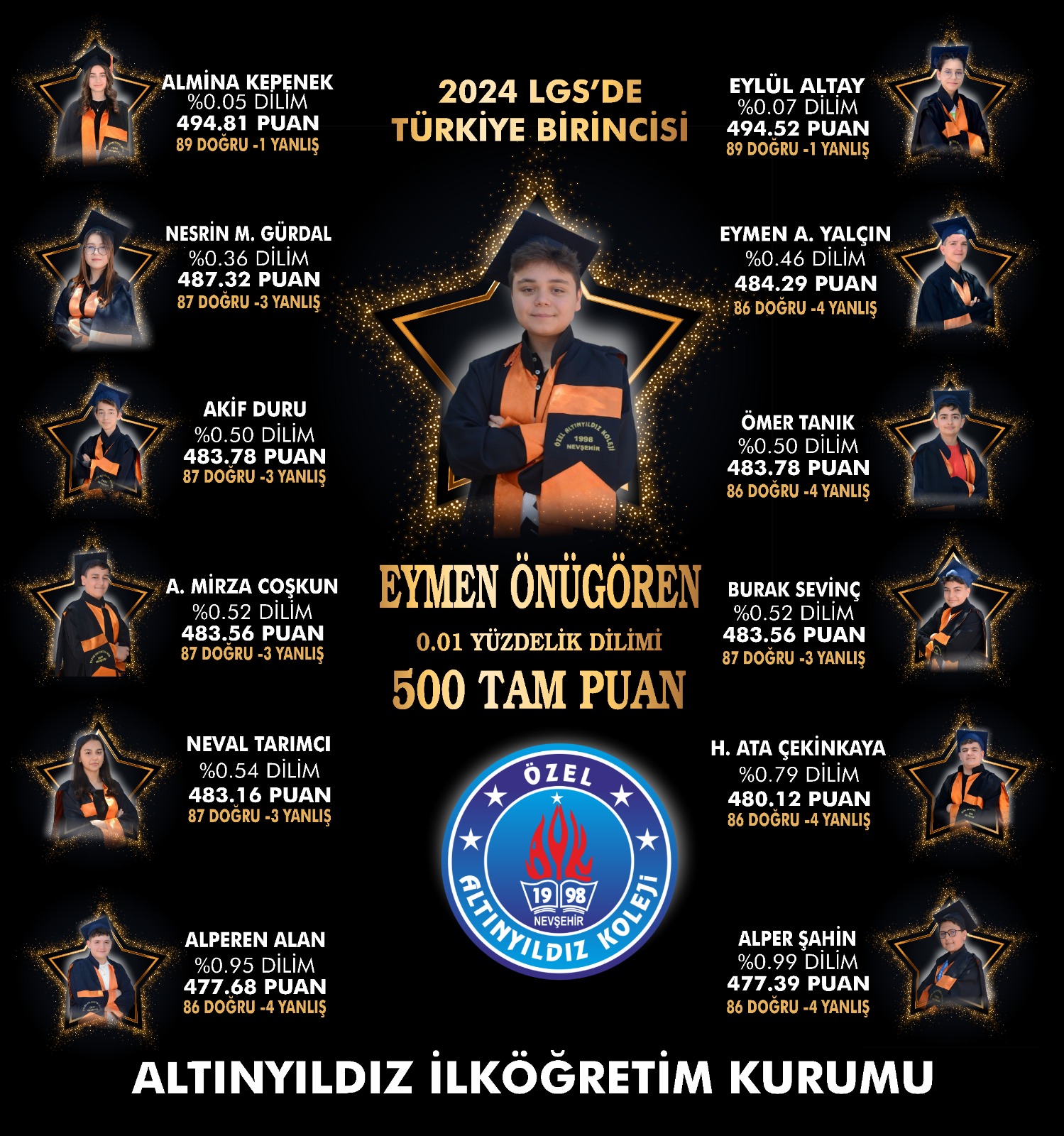 Altınyıldız İlköğretim Kurumu öğrencisi EYMEN ÖNÜGÖREN resmî sonuçlara göre sınavda tüm soruları doğru cevaplayarak Türkiye 1.liği elde etmiştir. Öğrencilerimizden;