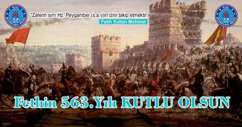 "Alemlerin sultanı Hz. Muhammed Mustafa (S.A.V)’in övgüsüne mazhar olarak bizlere dünya kenti İstanbul'u miras bırakan Fatih Sultan Mehmet Han‘ı, O’nun kumandasındaki kahraman ecdadımızı rahmet ve minnetle anıyor, İstanbul’un Fethi’nin 563 yıldönümünü kutluyoruz." Altınyıldız Koleji.