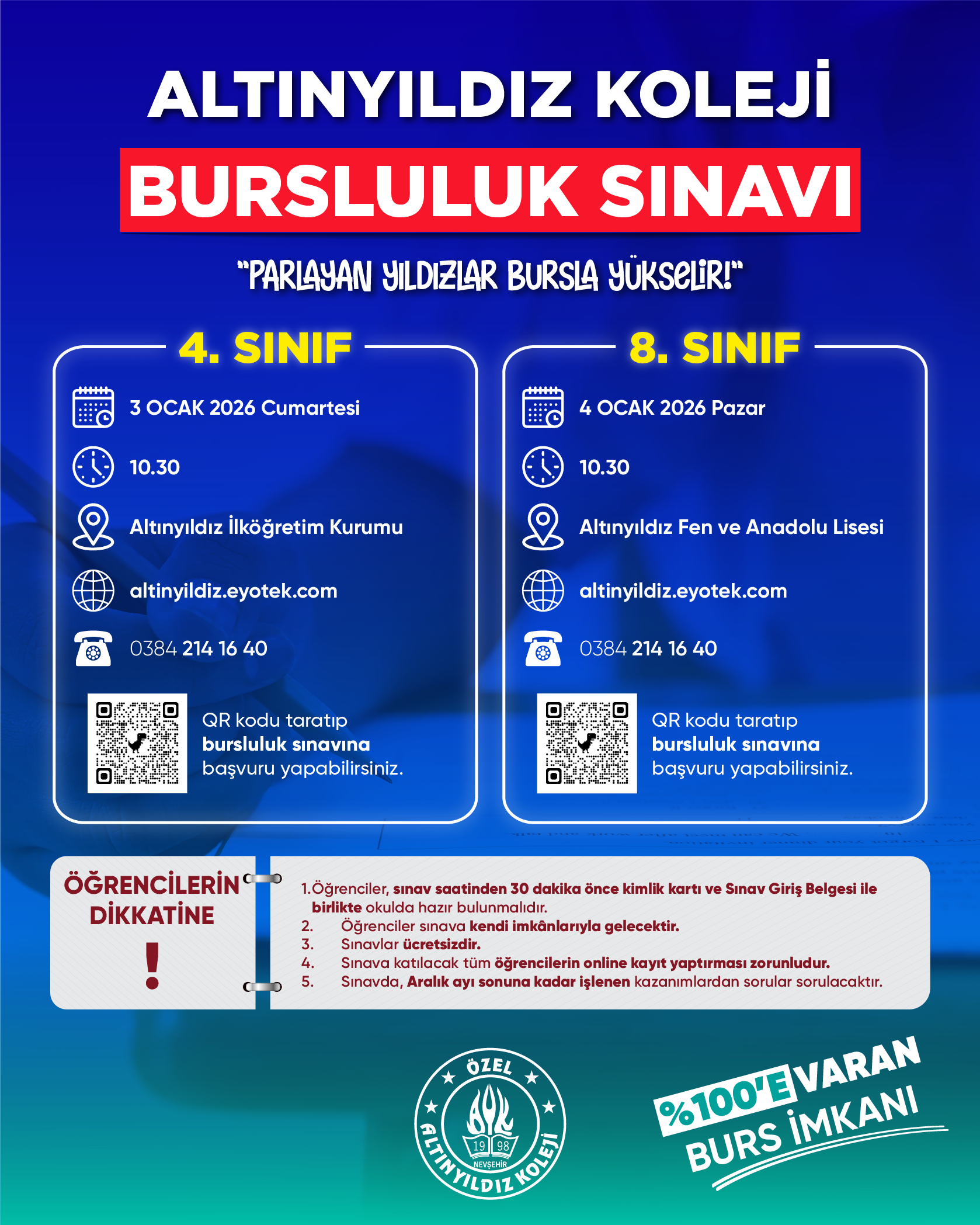 ALTINYILDIZ EĞİTİM KURUMLARINDA 2026 YILI BURSLULUK SINAVI BAŞVURULARI BAŞLADI.